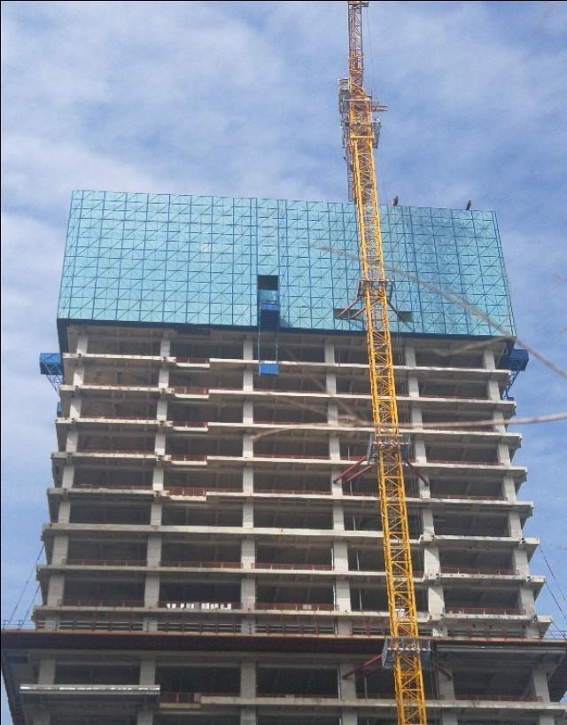 3、在建工程外侧应采用合格安全网封闭;卸料平台两侧栏杆自上而下加挂立网;每两层楼面四周挂平网;操作层下≤10m有平网;洞口边长>1.5m四周有防护栏杆,洞口下挂平网;电梯井内每隔两层≤10m一道平网。