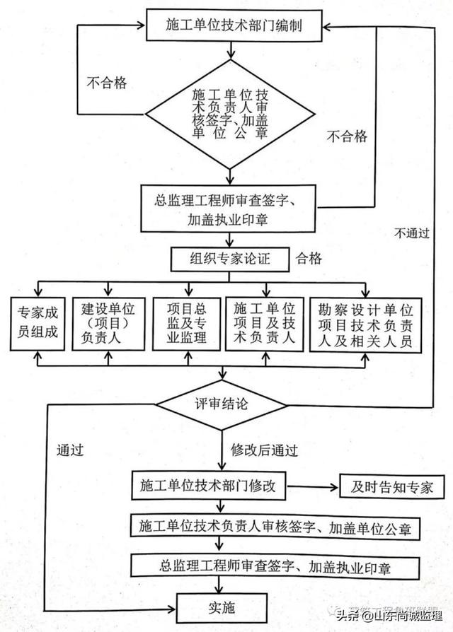 专项施工方案经论证需修改后通过的,施工单位应当根据论证报告修改完善后,专项施工方案应当由施工单位技术负责人审核签字、加盖单位公章,并由总监理工程师审查签字、加盖执业印章后方可实施。