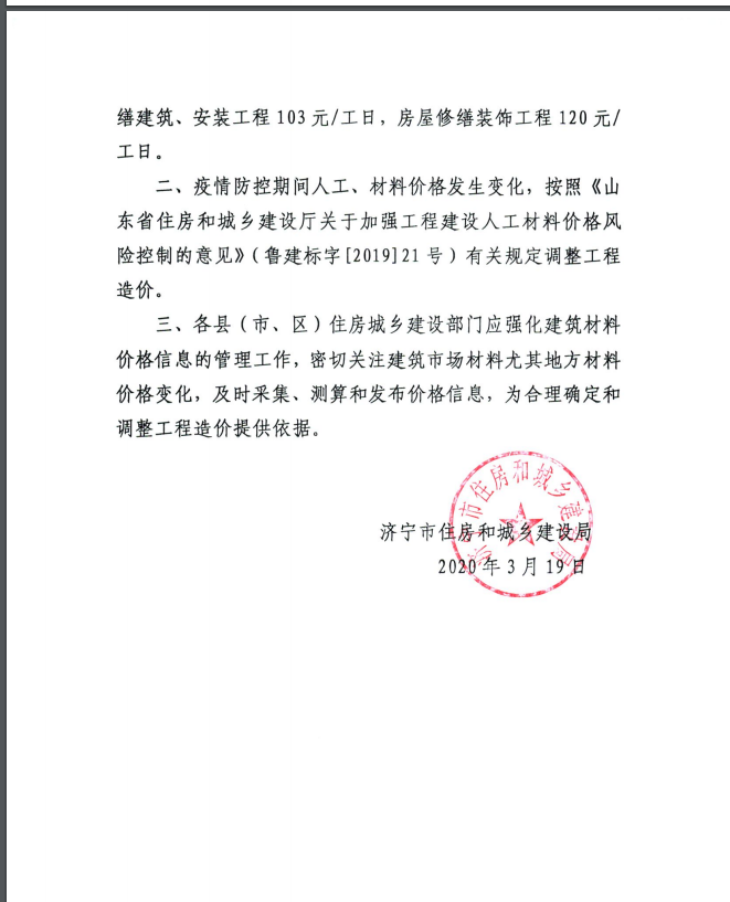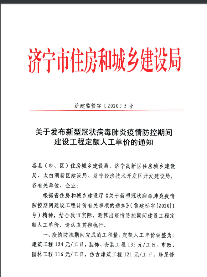 济建监管字〔2020〕5号关于发布新型冠状病毒肺炎疫情防控期间建设工程定额人工单价的通知