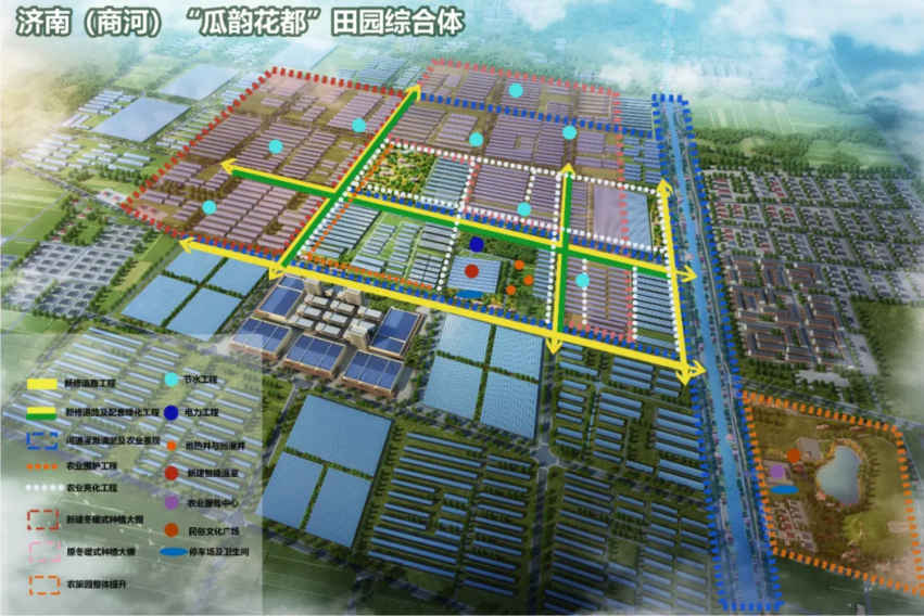 济南(商河)“瓜韵花都”田园综合项目包括两个主要部分,“郑路珍珠红”特色农业产业园和“万花部落”农业旅游文化园。通过建立农业产业集群,稳步发展创意农业,发展农业多功能性,促进农业产业与旅游,文化,康养等产业的深度融合,在绿色环保的基础上,充分利用自然景观。形成“观赏,游玩,宜居”的人居环境结合,“自然欣赏休闲”的居住环境和景观综合体,最终将济南(商河)“瓜韵花都”田园综合体建设为标杆,成为代表山东省的郊型特色高效农业样板。